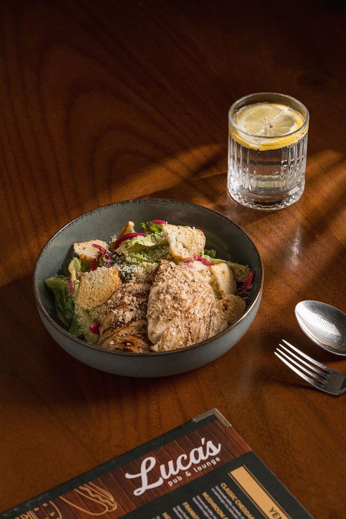 TAVUKLU SEZAR SALATA İçindekiler:Baby yedikule marulu, ızgara tavuk göğüs, kırmızı soğan turşusu, parmesan peyniri, ekşi maya kruton (alerjenler:laktoz, yumurta, gluten, balık ürünü) Fiyat: 380 TL