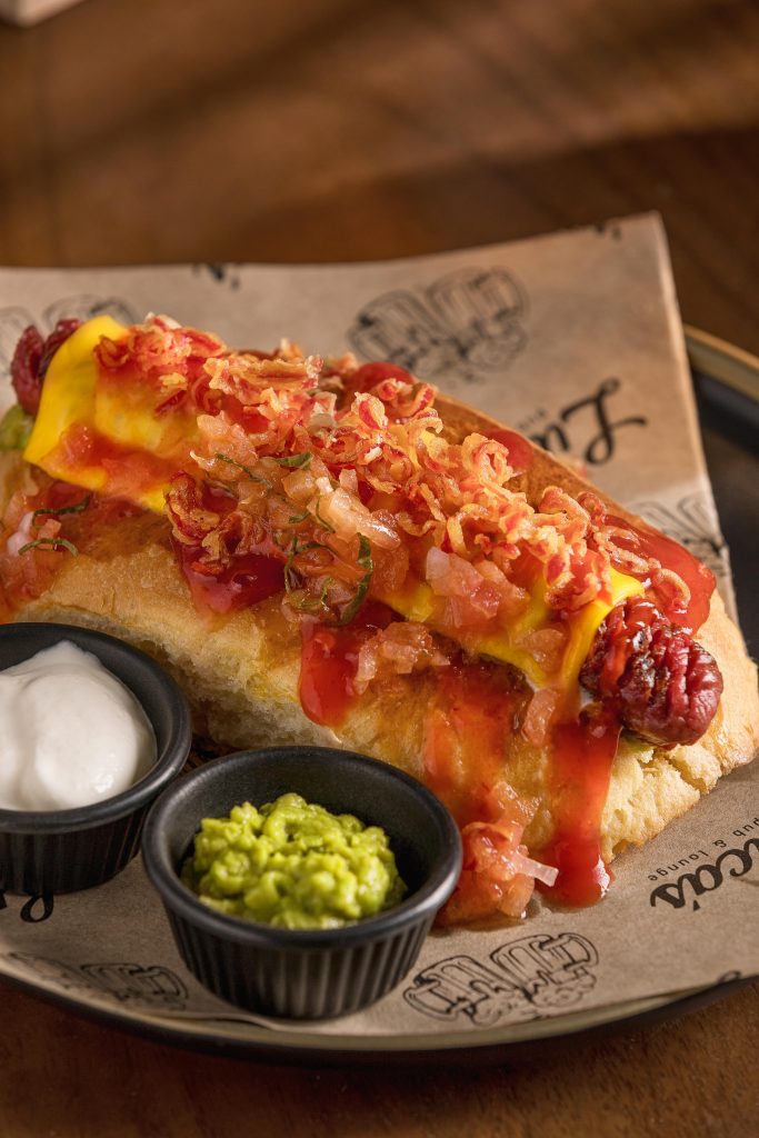 MAXICAN HOT DOG İçindekiler:Izgara frankfurter sosis, ekşi krema, guacamole, cheddar peyniri, kızarmış Meksika biberi, domates salsa (isteğe göre acılı) (alerjenler:laktoz, yumurta, gluten) Fiyat: 370 TL