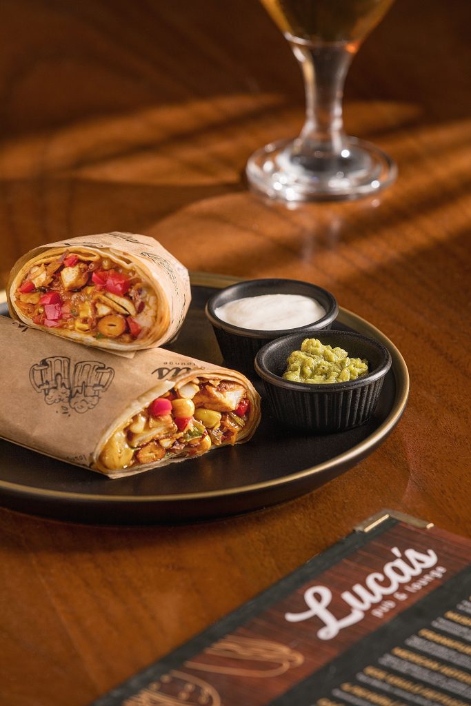 CHICKEN BURRITO İçindekiler:Izgara tavuk parçaları, renkli biberler, Meksika fasulyesi, mısır, cheddar peyniri, ekşi krema, guacamole ile (alerjenler:laktoz, yumurta, gluten) Fiyat: 320 TL